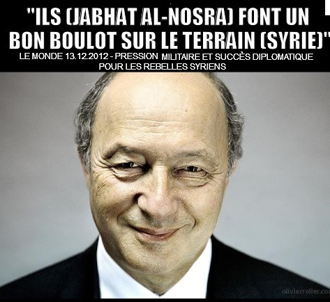 Georges Malbrunot dans Le Figaro de ce jour rend compte que « la position de la France, qui considère Ahrar al-Cham et l’Armée de l’islam comme des rebelles «modérés». «Ce qui nous importe, répond un diplomate français de haut rang, c’est que les groupes se rallient à la transition politique qui préconise un État civil et démocratique. Ahrar al-Sham et l’Armée de l’islam l’ont fait la semaine dernière à la conférence de Riyad. Pour nous, la liste des organisations terroristes, c’est celle déjà établie par les Nations unies.»