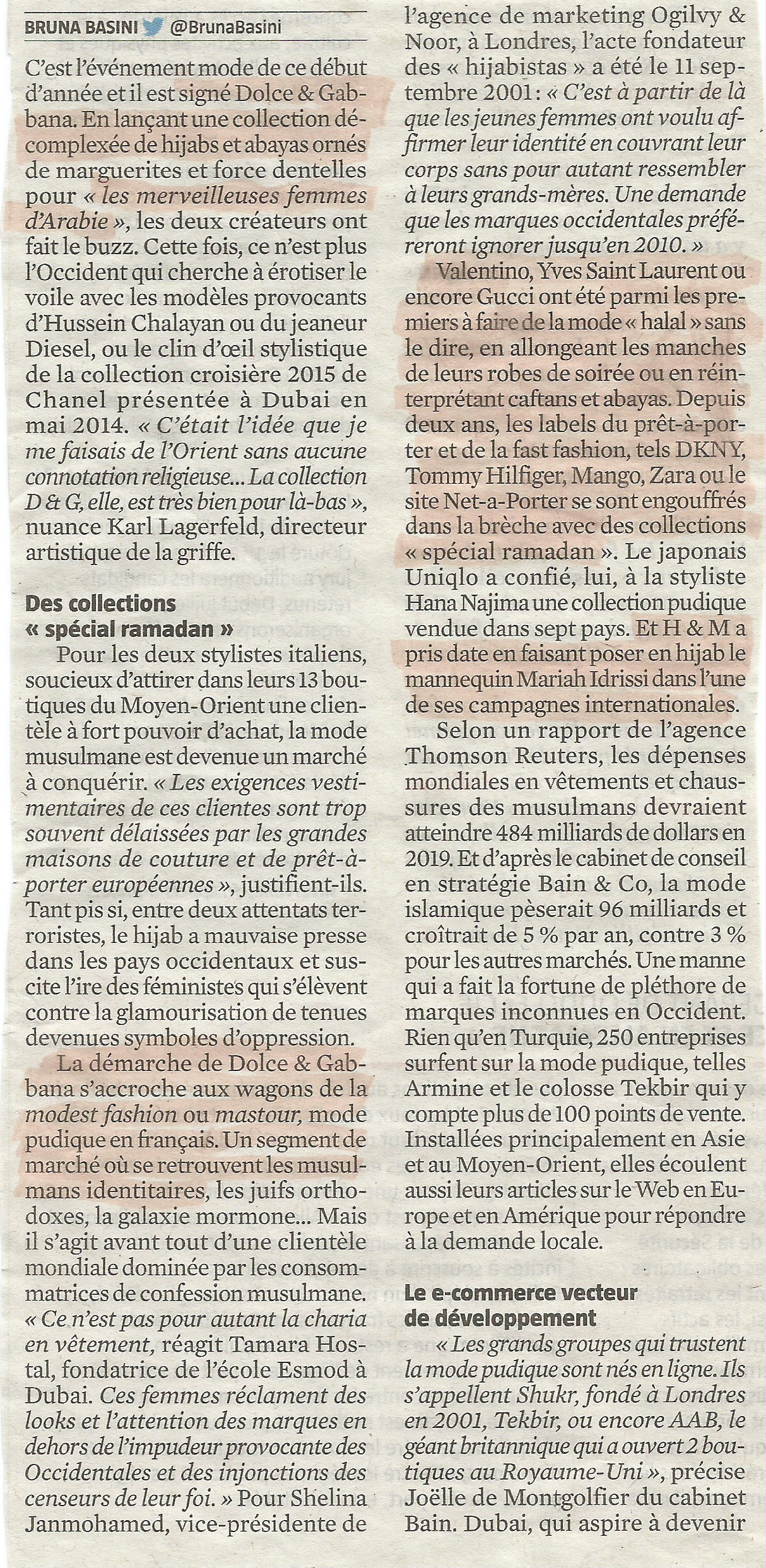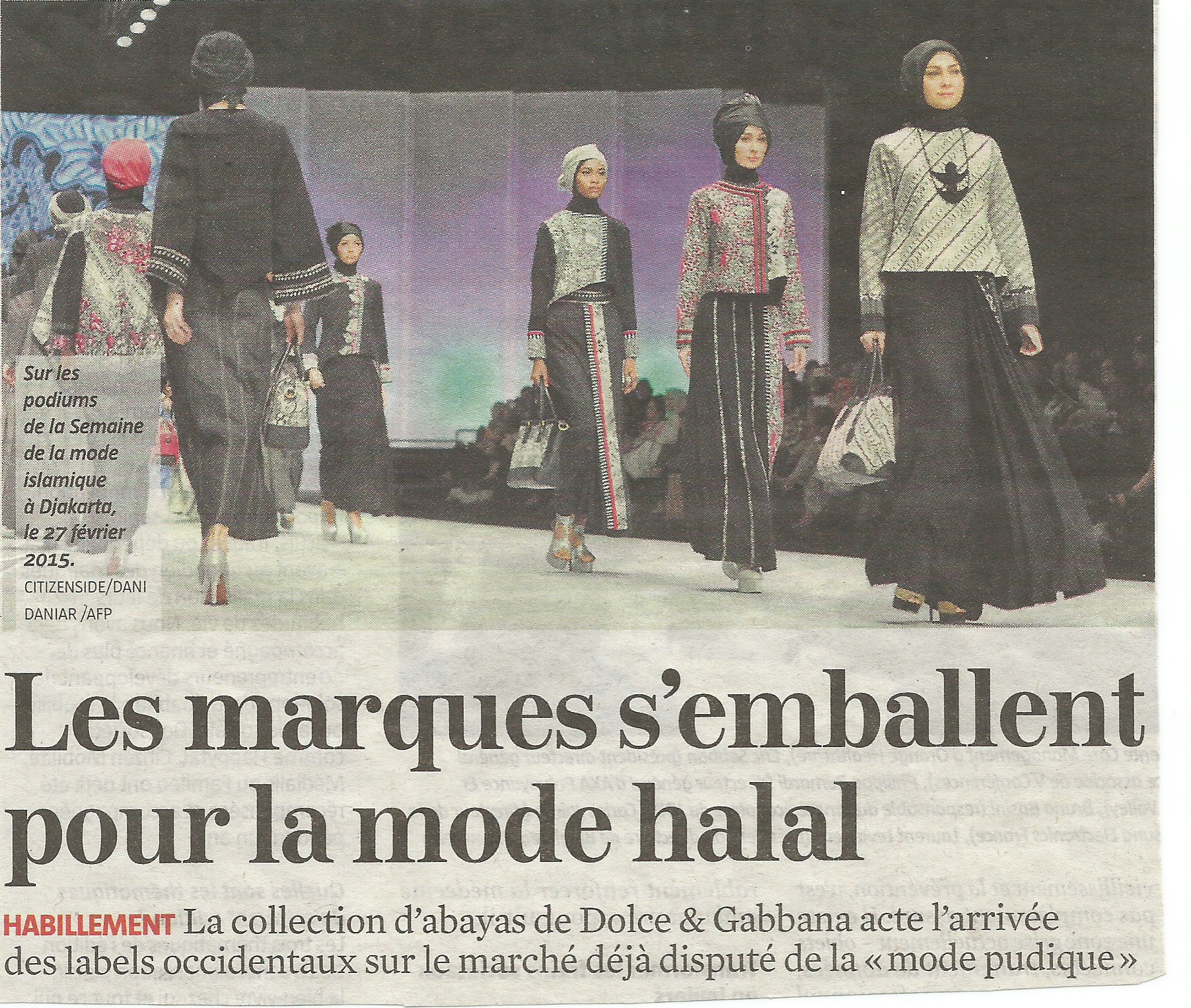 La haute couture occidentale s’islamise pour se lancer en terre d’islam et s’adapter au changement de peuple. Lu dans Le Journal du Dimanche du 24 janvier 2016 :