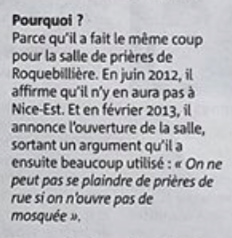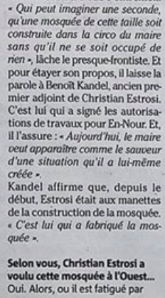 « Le maire a approuvé le projet » a dénoncé pour sa part lundi son ancien 1er adjoint Benoit Kandel passé dans l’opposition sans étiquette, accusant M. Estrosi d’être un « menteur« . Il a rappelé que la mosquée avait reçu des avis favorables en 2012 de la commission de la sécurité et de la commission de l’accessibilité de la ville de Nice pour ouvrir au public. M. Estrosi a rétorqué qu’il n’avait pas été tenu au courant par son ancien adjoint. «  source