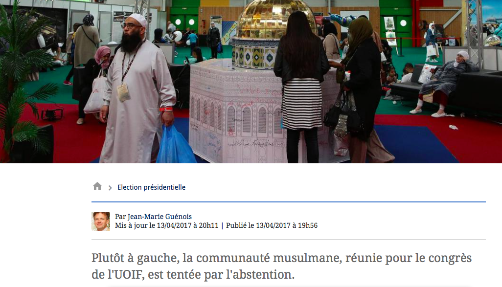 - « Les musulmans très déçus des années Hollande » avec l’accroche « Plutôt à gauche, la communauté musulmane, réunie pour le congrès de l’UOIF, est tentée par l’abstention ». (article de Jean-Marie Guénois).