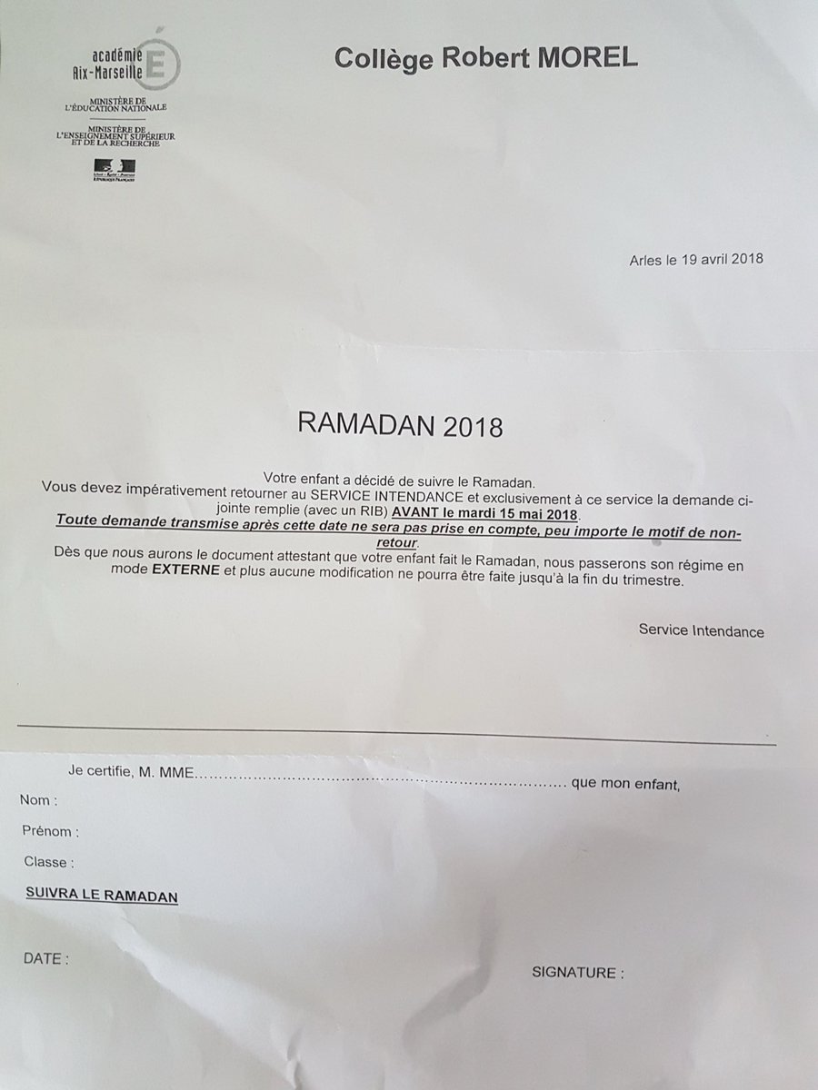 Accueil | Actualités | Un collège de l’Académie de Marseille recense les élèves faisant ramadan pour l’intendance