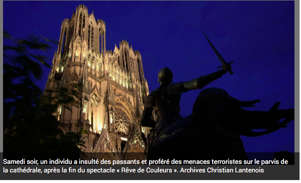 Samedi soir, après le spectacle son et lumière, un individu a crié « Allahou Akbar ! Vive Daech ! Je vais vous égorger ! » à toutes les personnes qu’il croisait devant la cathédrale de Reims. « Je vais faire un attentat ! Je vais faire sauter la cathédrale ! », a-t-il ajouté. Un passant qui s’interposait a été giflé.