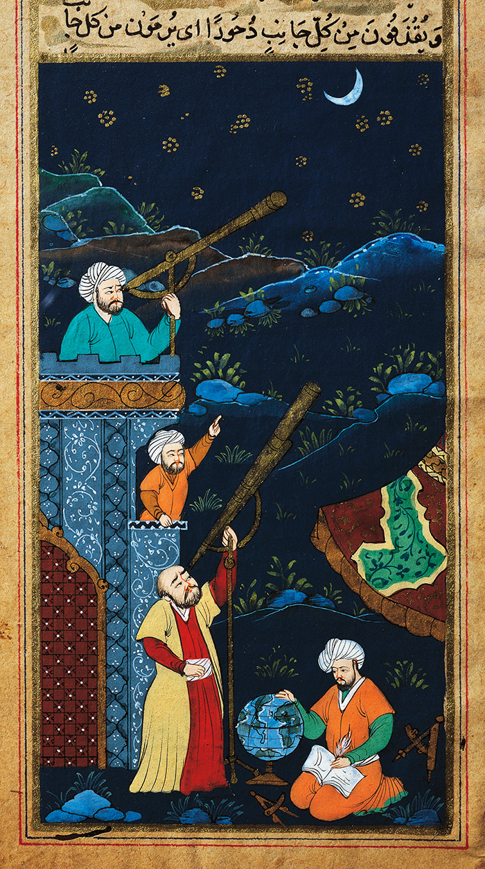Alors que je me préparais à enseigner à ma classe « Science et Islam » au printemps dernier, j’ai remarqué quelque chose de particulier dans le livre que j’étais sur le point de remettre à mes élèves. Ce n’était pas le texte – une merveilleuse traduction d’une encyclopédie arabe médiévale – mais la couverture. Son illustration montrait des érudits en turbans et en costumes médiévaux du Moyen Orient, examinant le ciel étoilé à l’aide de télescopes. L’enluminure était censée venir du Moyen-Orient prémoderne, mais quelque chose n’allait pas.