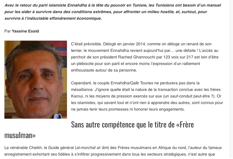 Yassine Essid (Wikipedia) sur Kapitalis a écrit le 17 novembre une tribune intitulée « Petit manuel pour survivre au retour d’Ennahdha :